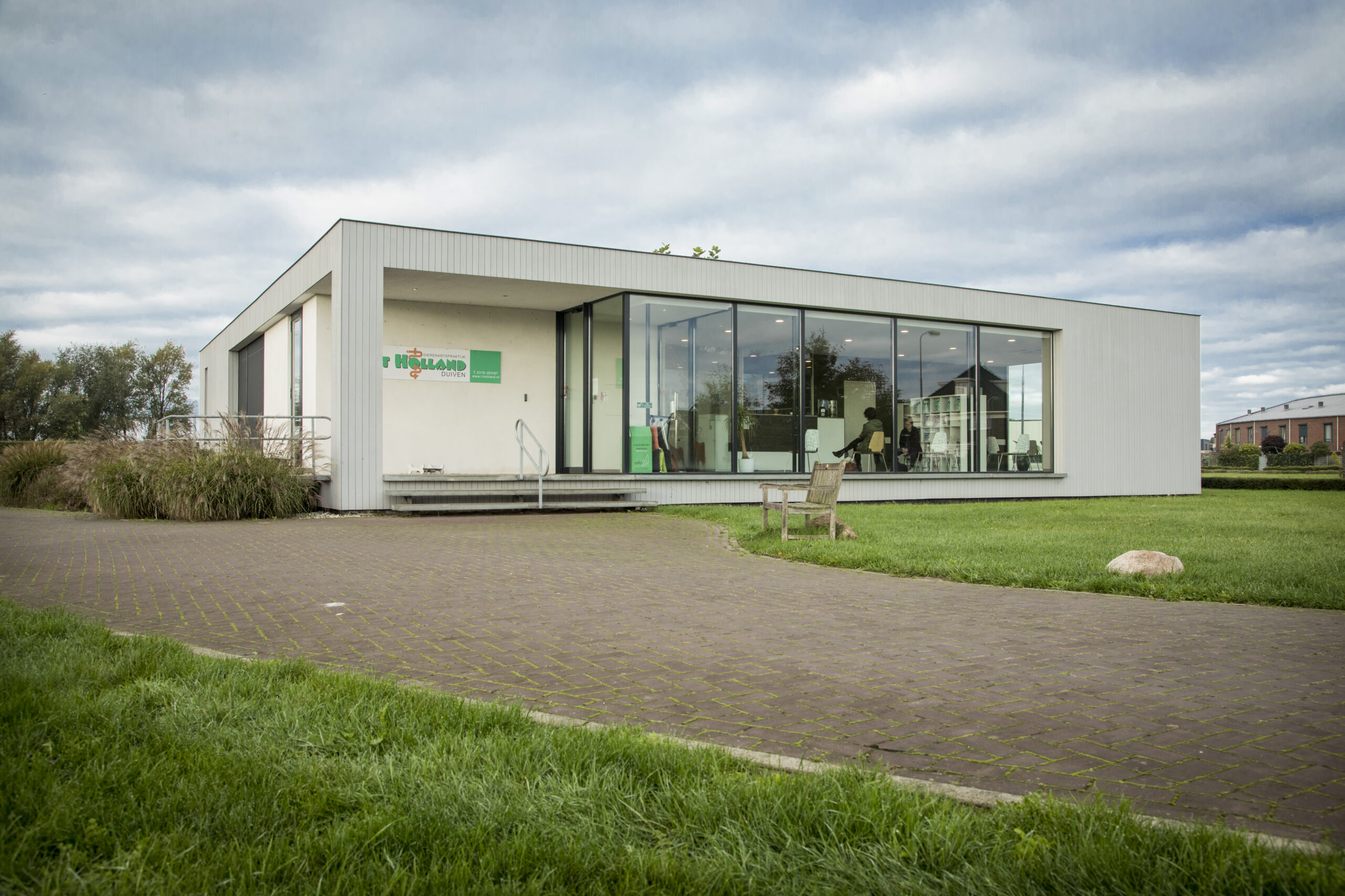 Het resultaat is de praktijk als paviljoen in een ruim opgezet park waarbij wandelaars met hun hond kunnen wandelen door het groen en, als nodig, kunnen schuilen voor de regen onder de luifel van deze royaal opgezette entree. Verder zijn voor alle ramen letterlijk vensterbanken gemaakt waar bezoekers van het park rustig in het zonnetje kunnen genieten van de groene omgeving.