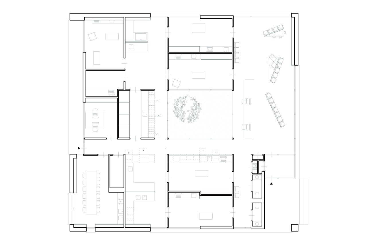 De buitenruimte is in eerste instantie ontworpen om de aangelegen spreekkamers van daglicht te voorzien, maar is tevens het hart van de praktijk dat alle ruimtes visueel met elkaar verbindt. De transparantie die de organisatie wil uitstralen wordt hierin vertaald.